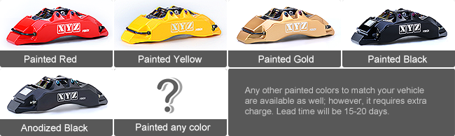 Painted red, yellow, gold, black and anodized black are our caliper standard colors.